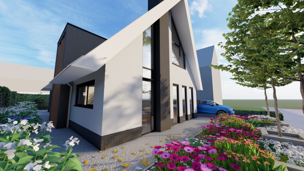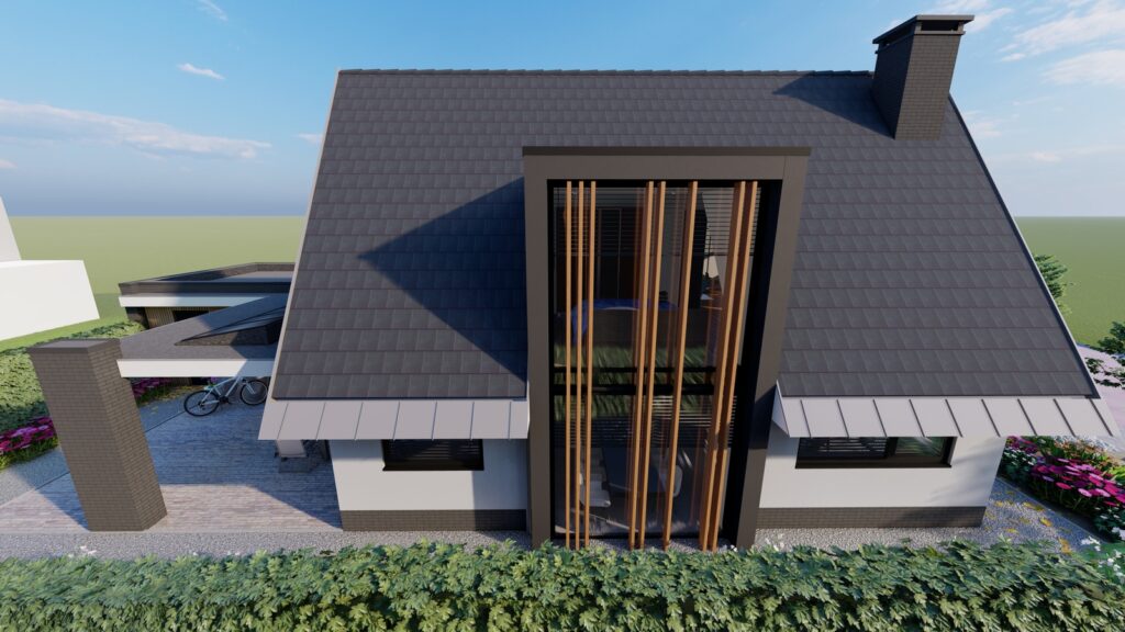 De wens van de opdrachtgevers was een moderne woning met een groot contrast tussen wit en zwart. Wat daarom direct opvalt aan de woning is het spannende contrast tussen het witte stucwerk met de donkere baksteen en het donkere dak. De dakvorm wordt versterkt door de strakke witte gootlijn. De gefelste zinken afwerking op de goot geeft de woning het robuuste stoere karakter. Om meer warmte aan het huis te geven, is gekozen om enkele houten elementen in de woning terug te laten komen.