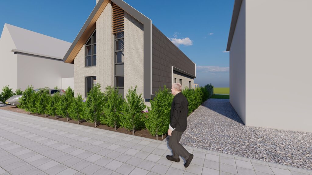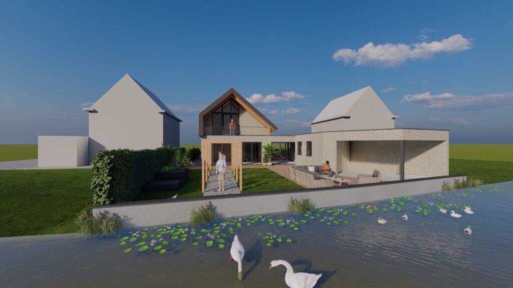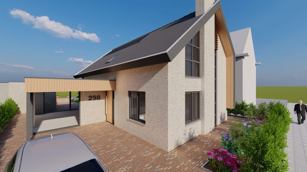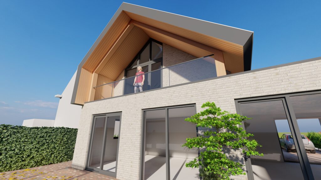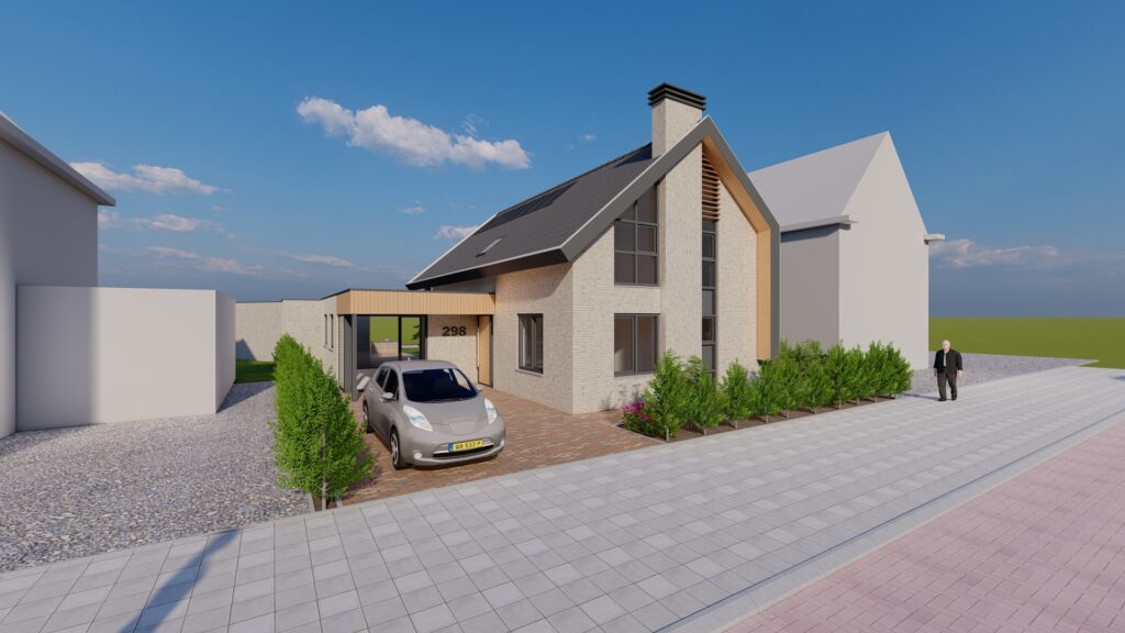 De woning is ontworpen in een moderne bouwstijl. De grijze gevelkleuren geven de woning een moderne statuur maar met de houten elementen in de gevel houdt de woning zijn warmte.