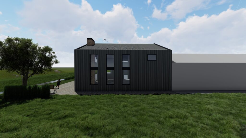Om de woning tussen de bedrijfsgebouwen in te passen, is gekozen voor een metalen gevelbeplating. Ook is de vorm van de bestaande loods overgezet naar de woning.