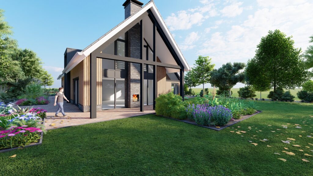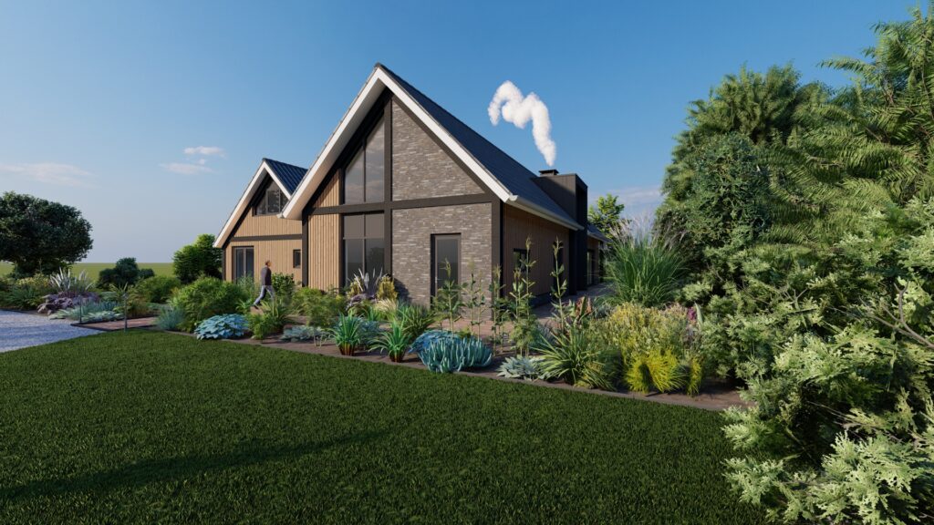 Het achtergelegen landschap is weidser van karakter. Hier liggen ook de gewenste wegkijklijnen vanuit de woning. Hierdoor is de achterzijde ontworpen met een open karakter, wat ook in de beplanting zal worden doorgevoerd.