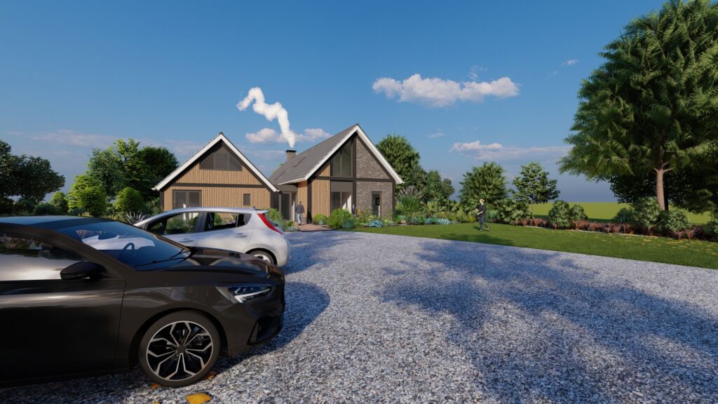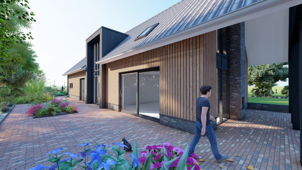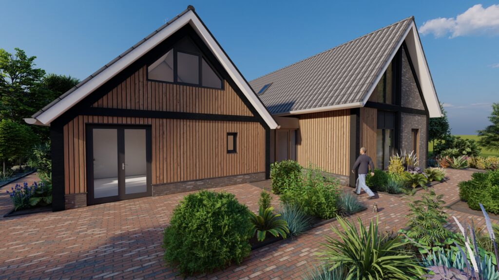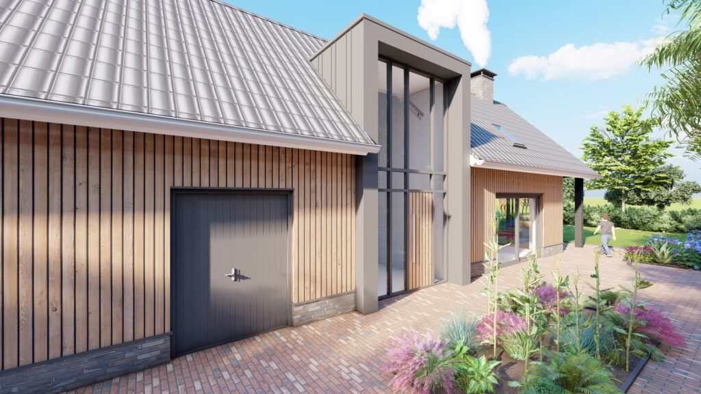 De woning is ontworpen als schuurwoning. Wat met de natuurlijke kleuren en tinten goed past binnen het landelijk en bosrijke gebied. De woning heeft door de lage goten en de flauwe, behouden dakhelling een landelijke maat en schaal.