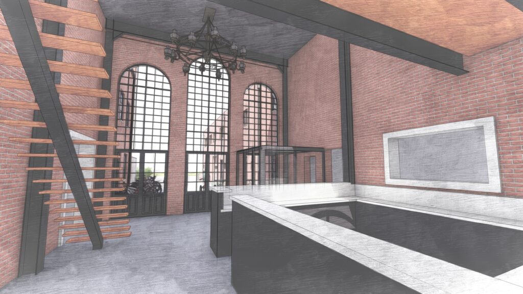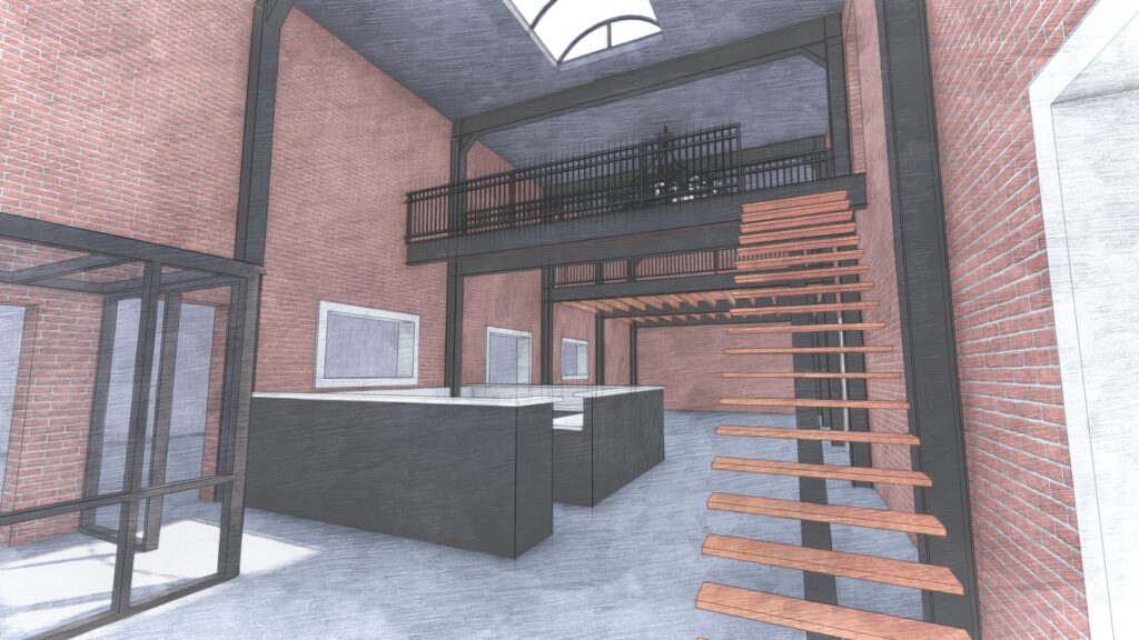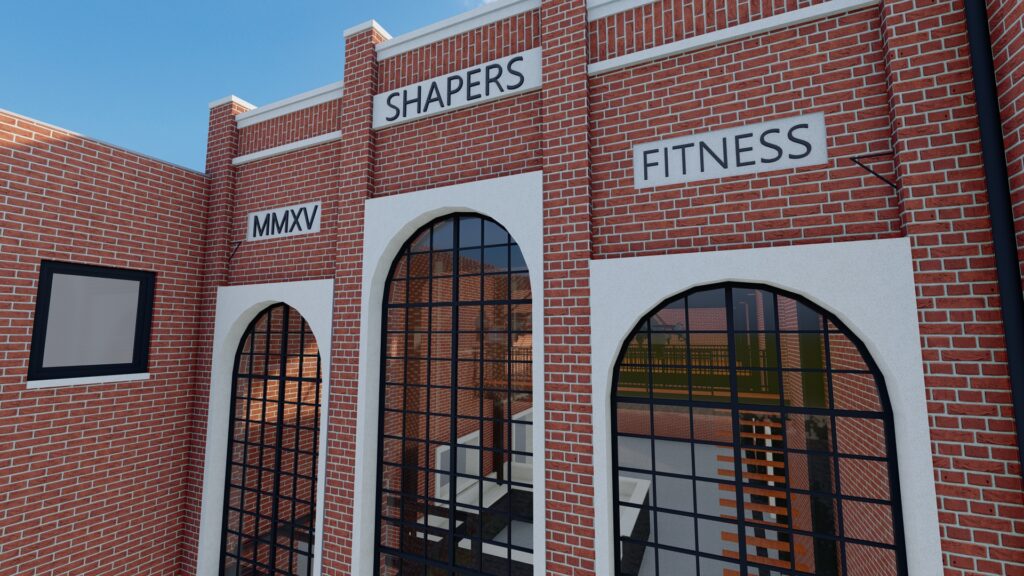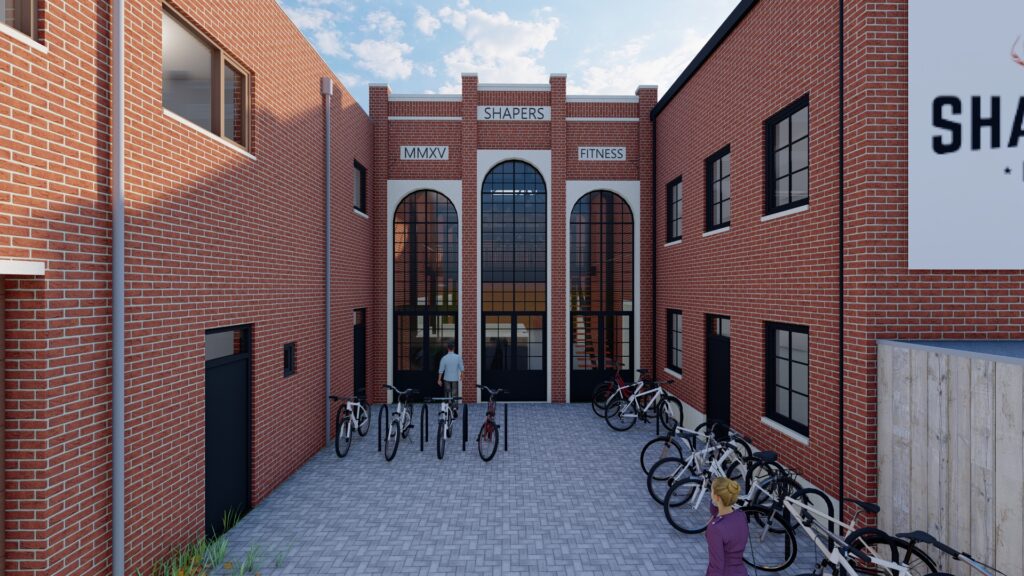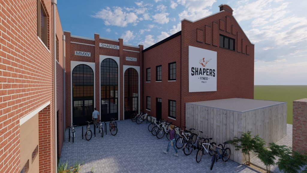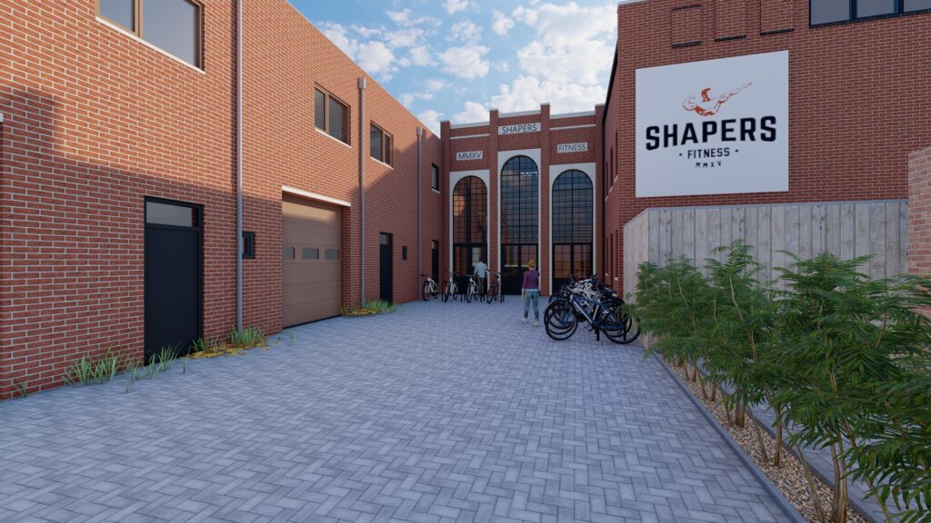 Het verbindingsstuk tussen de bestaande gebouwen en de nieuw aangeschafte loods wordt ontworpen als een industrieel robuust gebouw. Dit ontwerp sluit perfect aan bij de identiteit van Shapers Fitness.