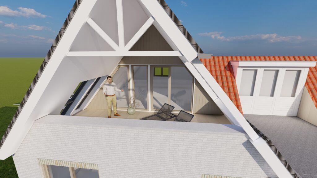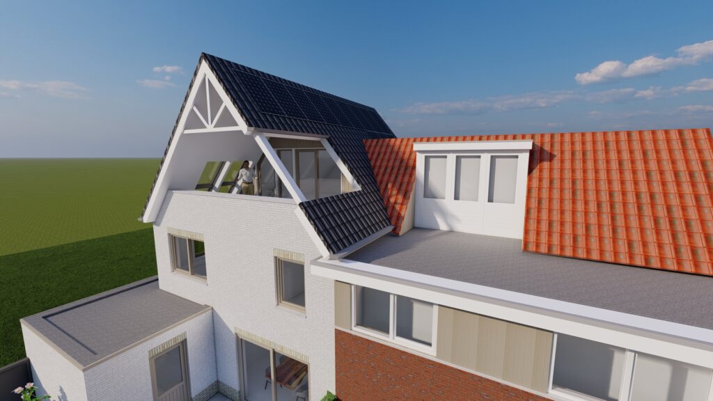 Een van de opvallende kenmerken van het nieuwe ontwerp is de kap die dwars op de bestaande rij is geplaatst. Deze architectonische keuze zorgt voor een visueel onderscheid tussen de oude rijwoning en de nieuwe woning. Het benadrukt de uitbreiding en geeft het geheel een moderne uitstraling.