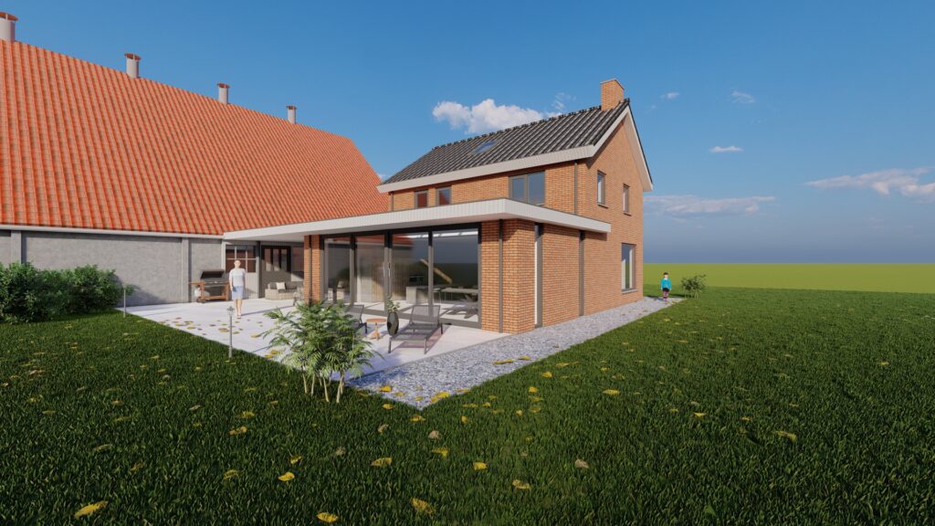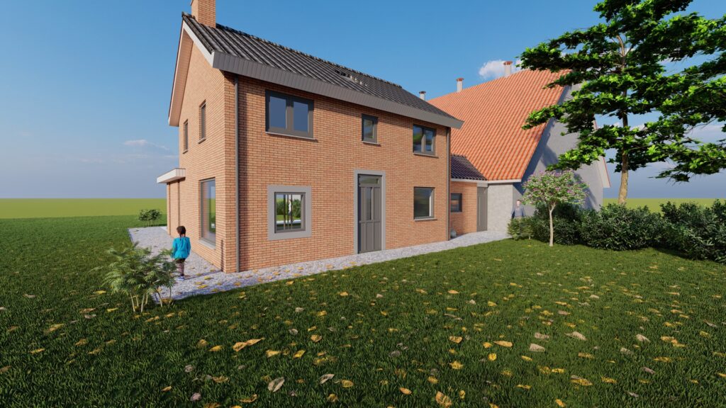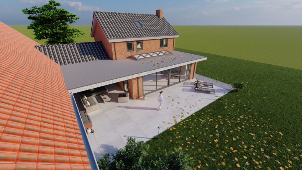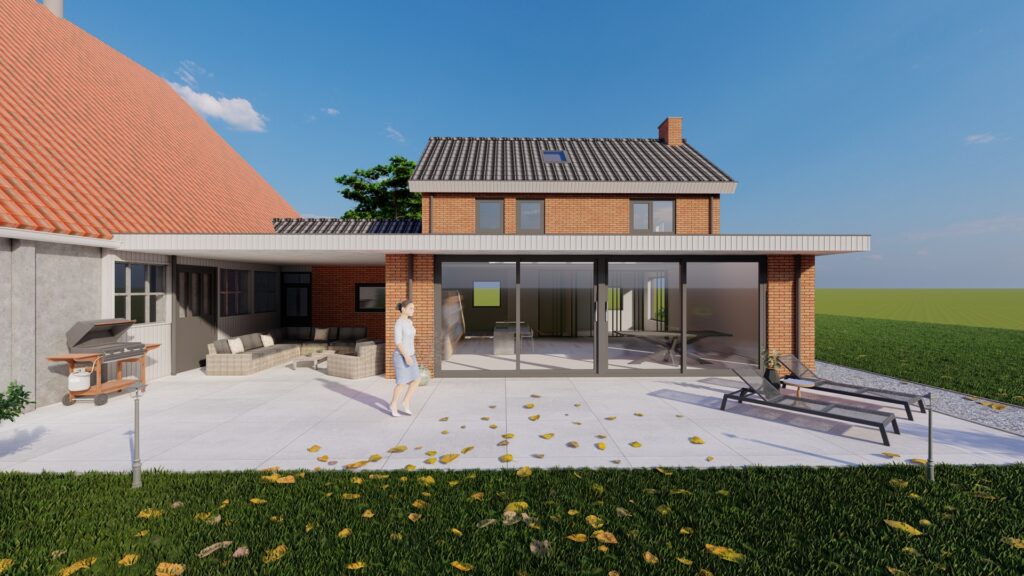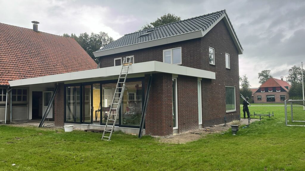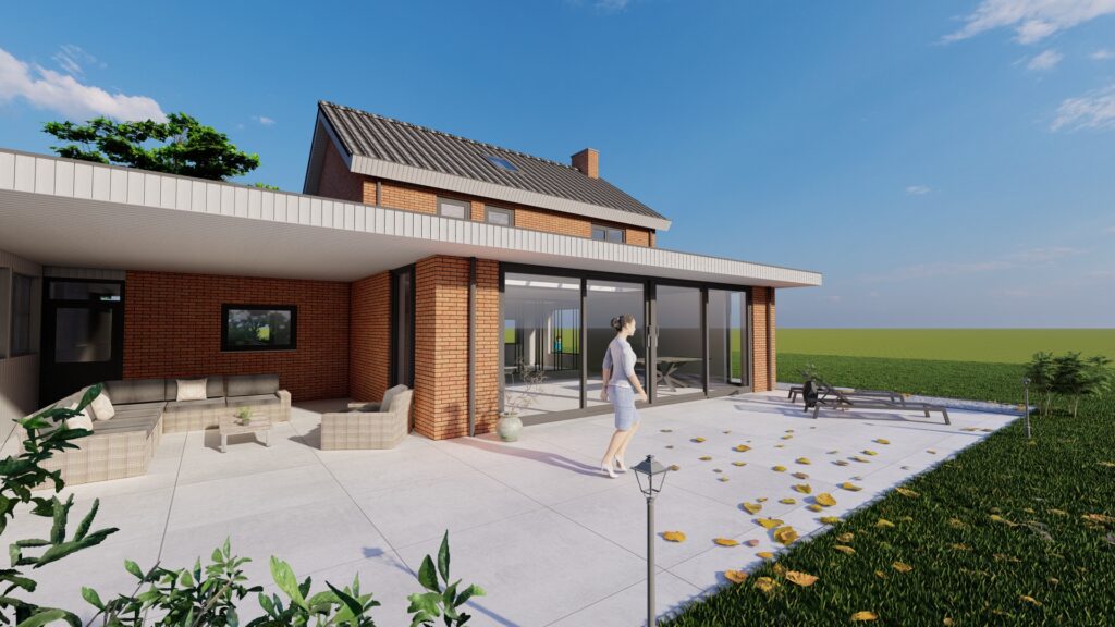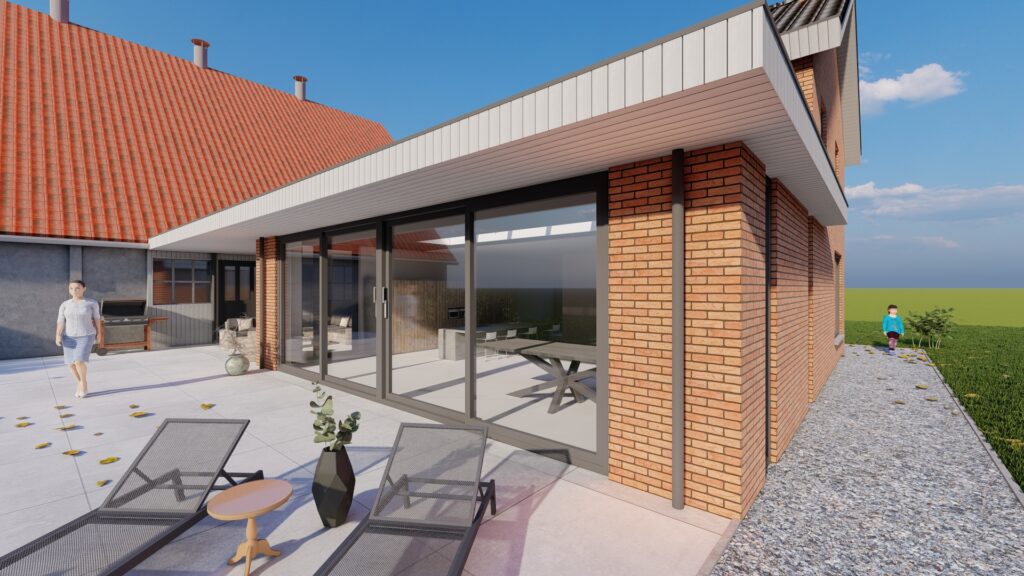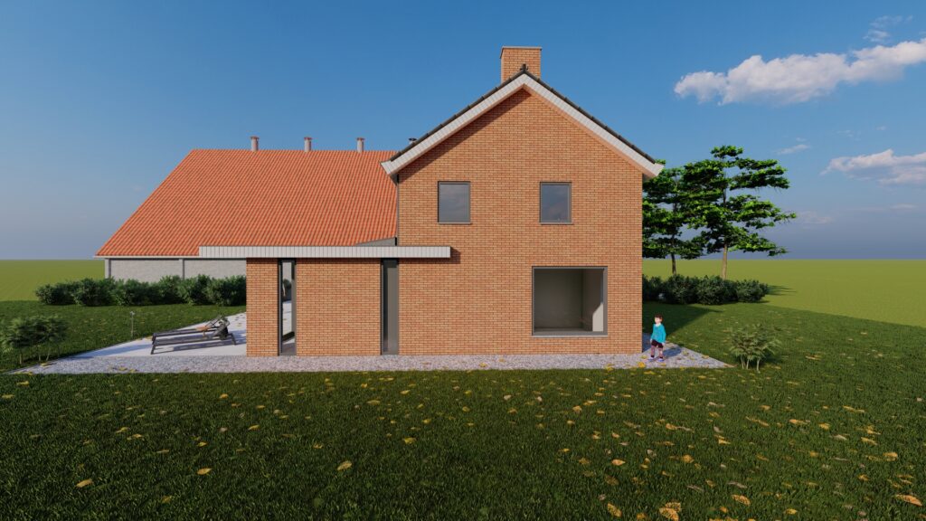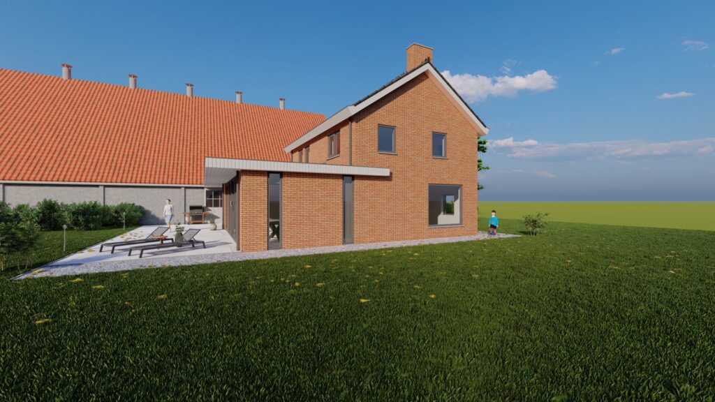 Voor deze boerderij woning in de noordoostpolder mochten wij de bouwplannen maken voor een uitbreiding. De dragende wanden uit de woning zijn verwijderd en er is 1 grote leefruimte gemaakt. Deze leefruimte is ook uitgebreid met aan de achterzijde een grote pui voor veel daglicht.